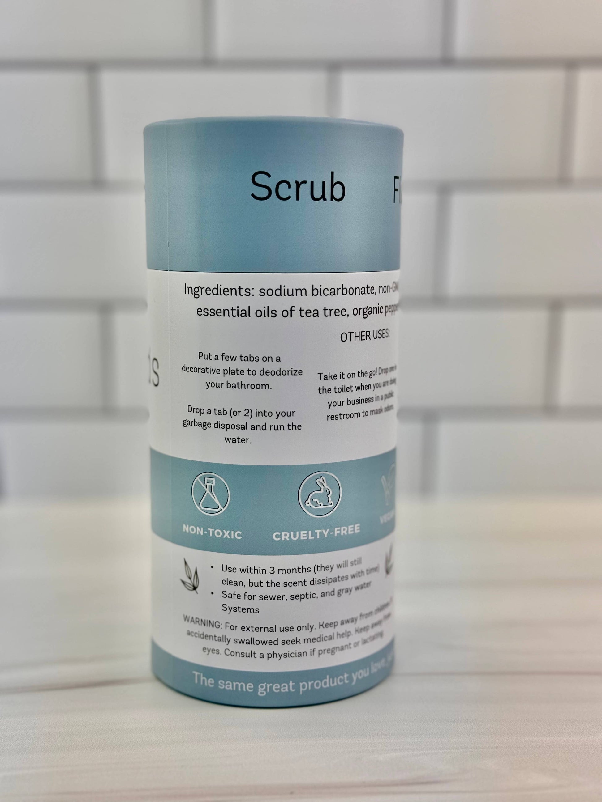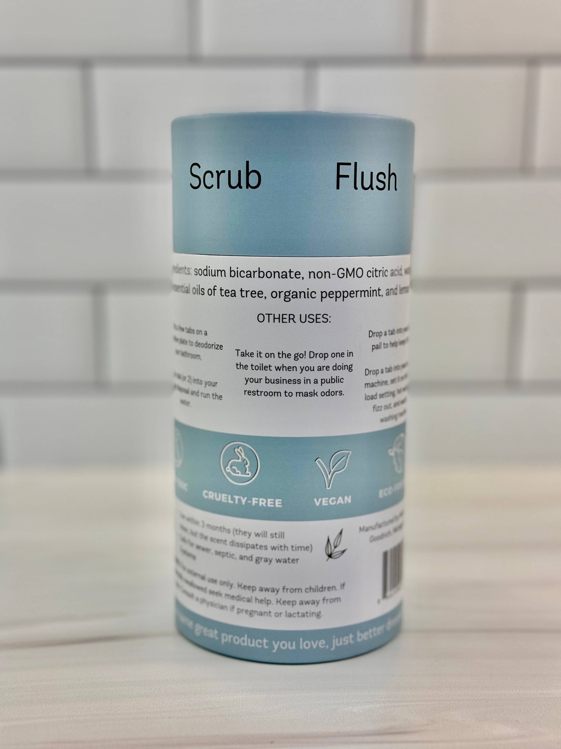 ⢠ingredients: sodium bicarbonate, non-GMO citric acid, water, essential oils of organic peppermint, tea tree + lemon.