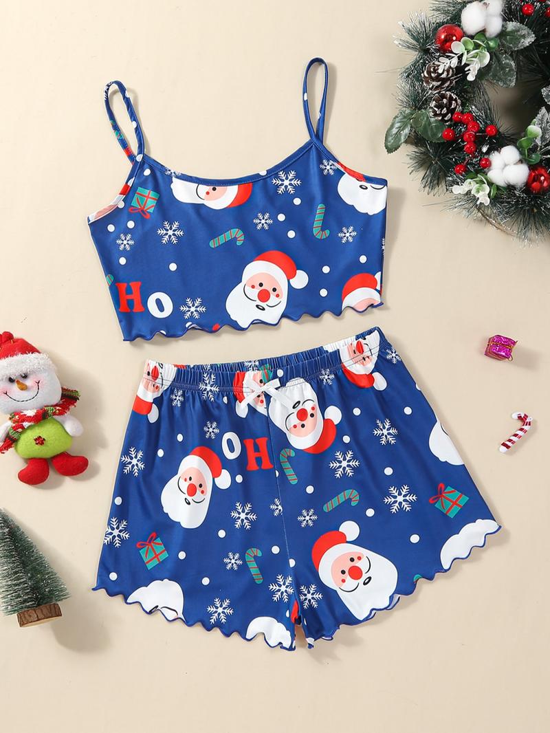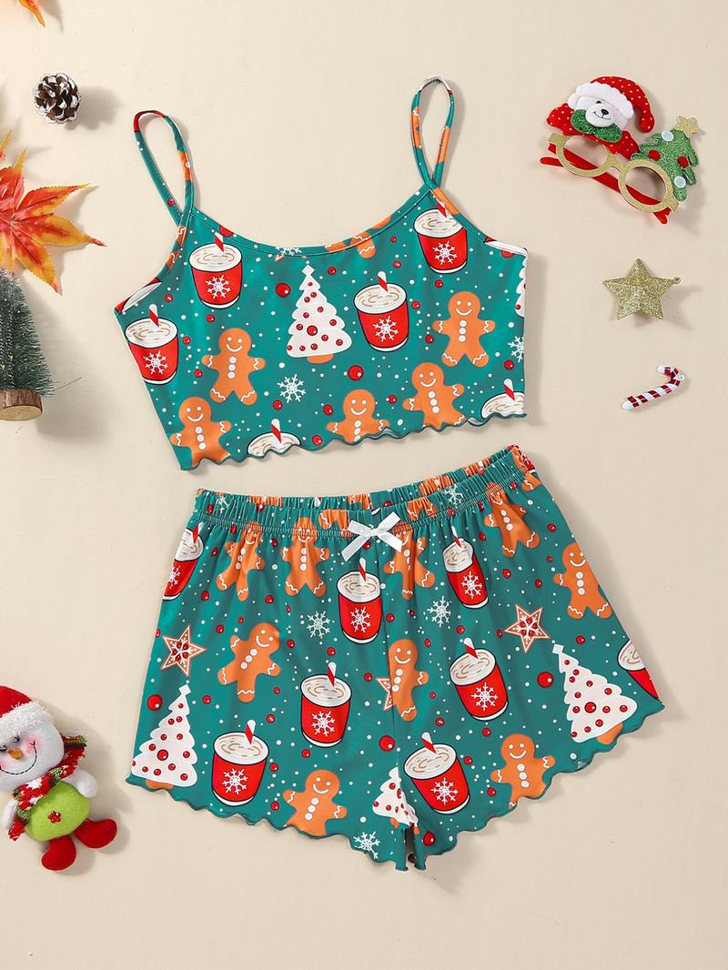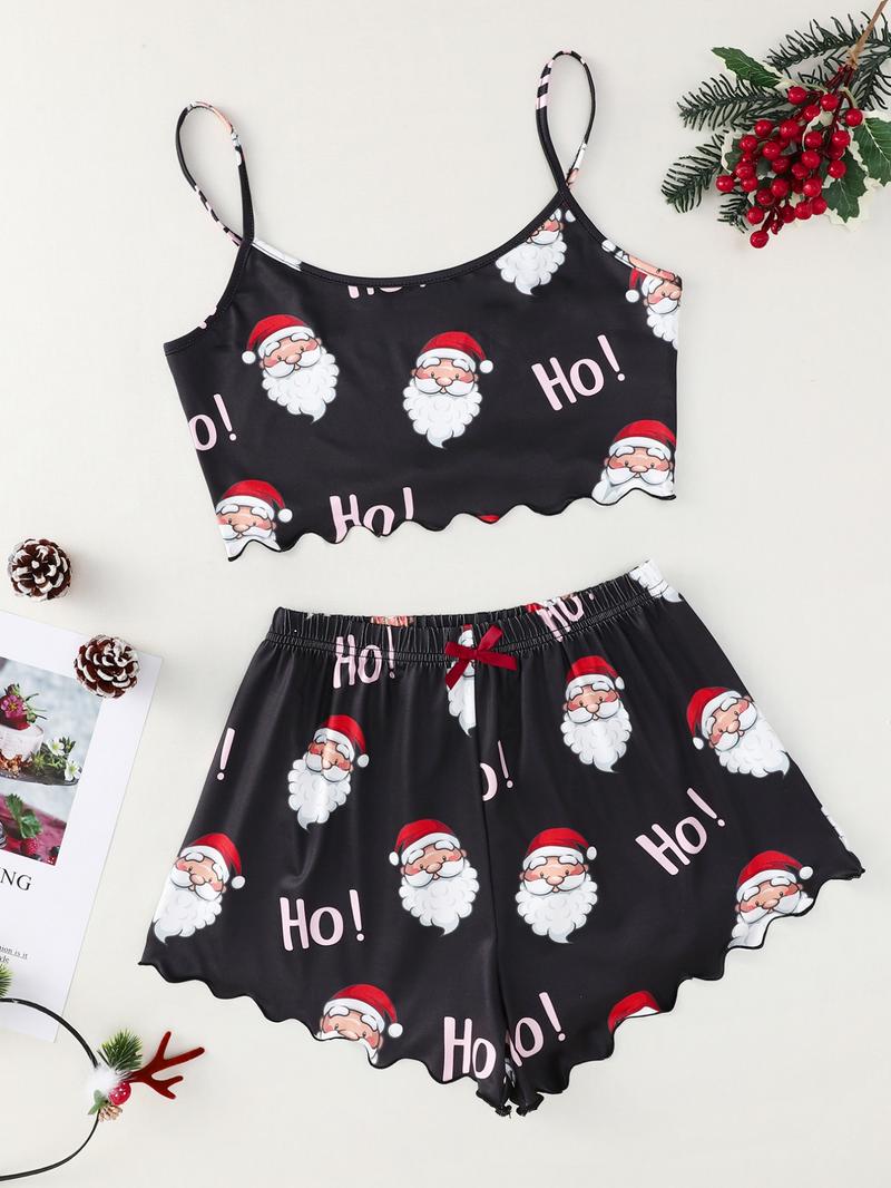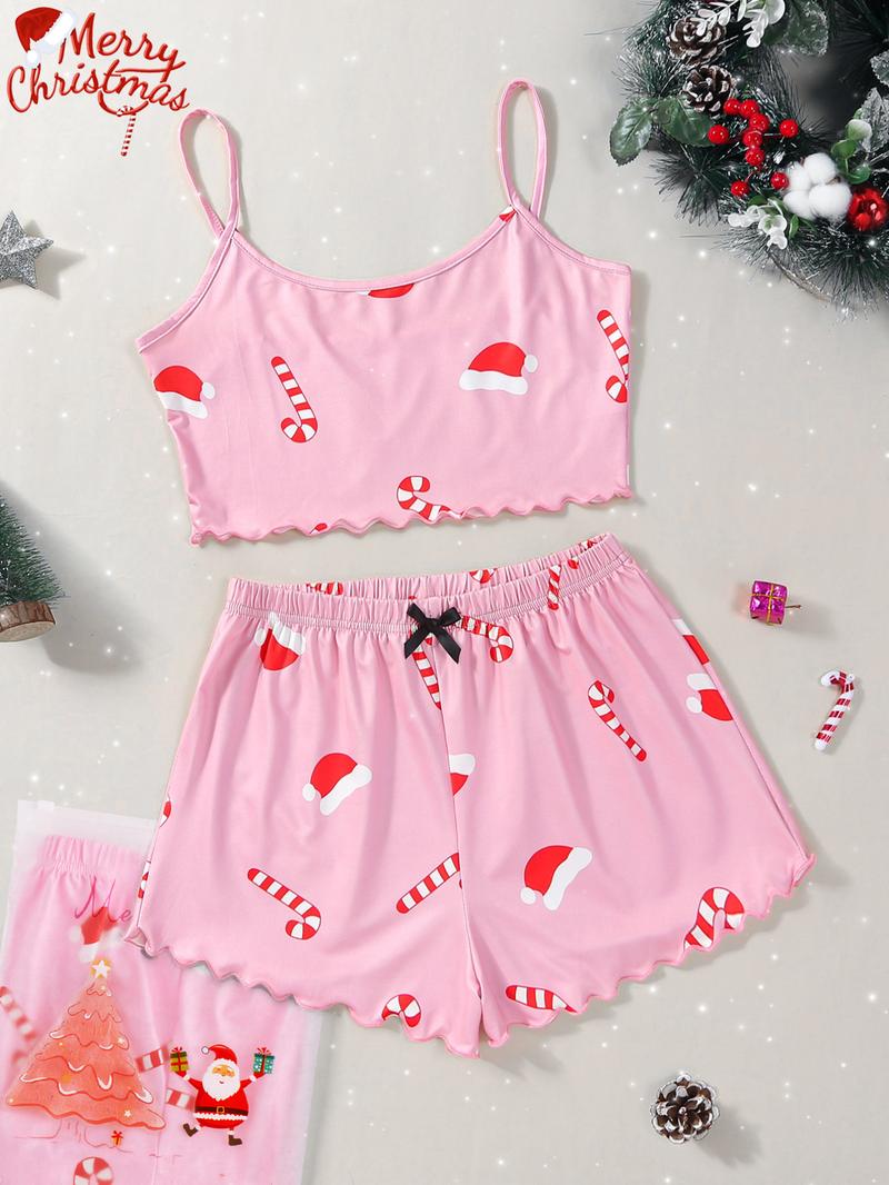 Two-Piece Set Women'S Christmas Cartoon Graphic Bow Pajamas Set, Comfort Scallop Trim Camisole & Elastic Waist Pants Loungewear Set for Fall, Christmas Pajamas, Comfort Homewear for Lady Birthday Gifts